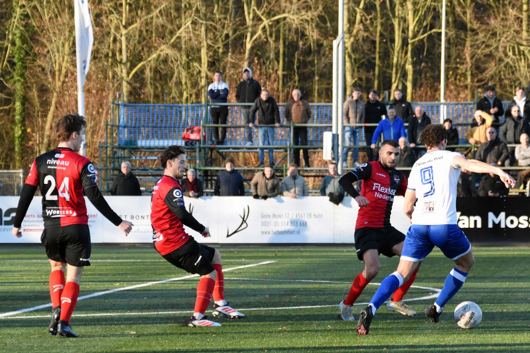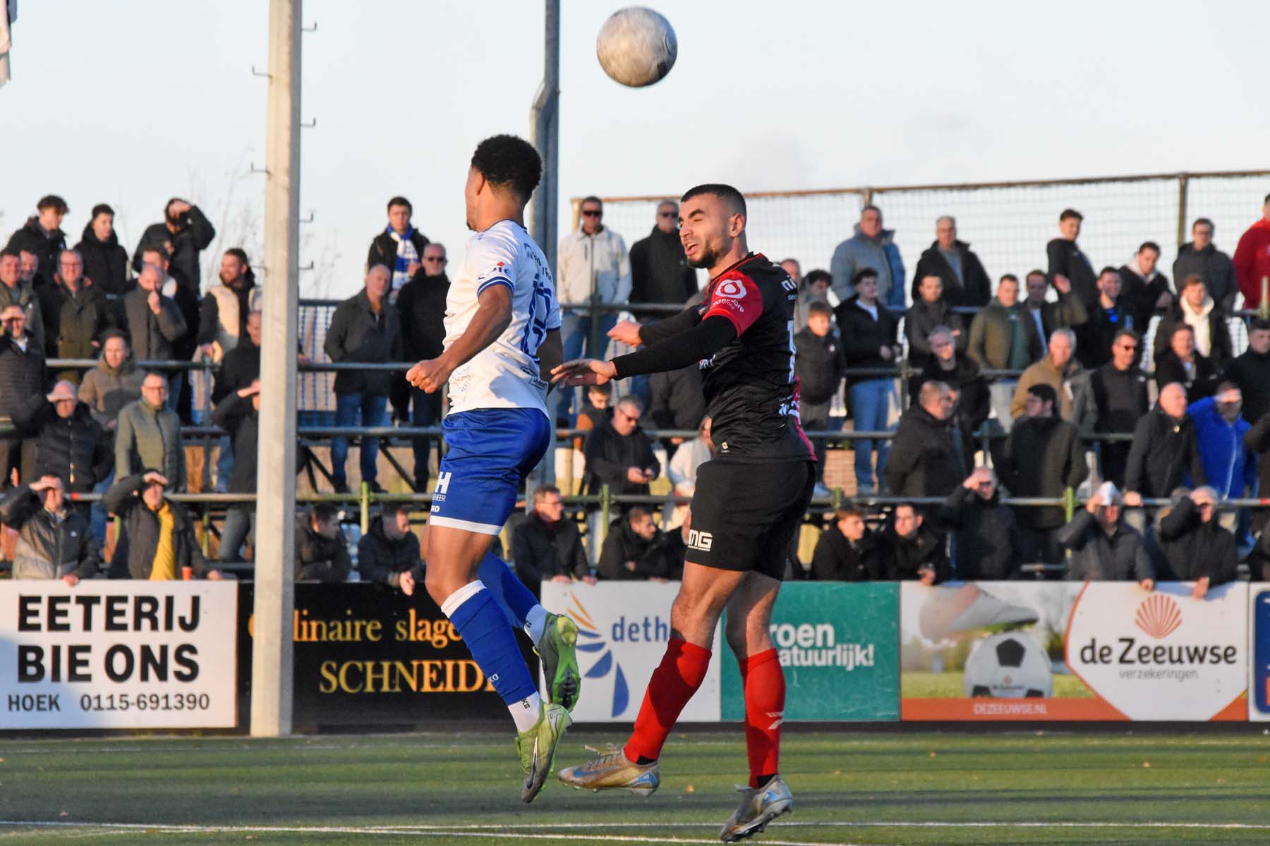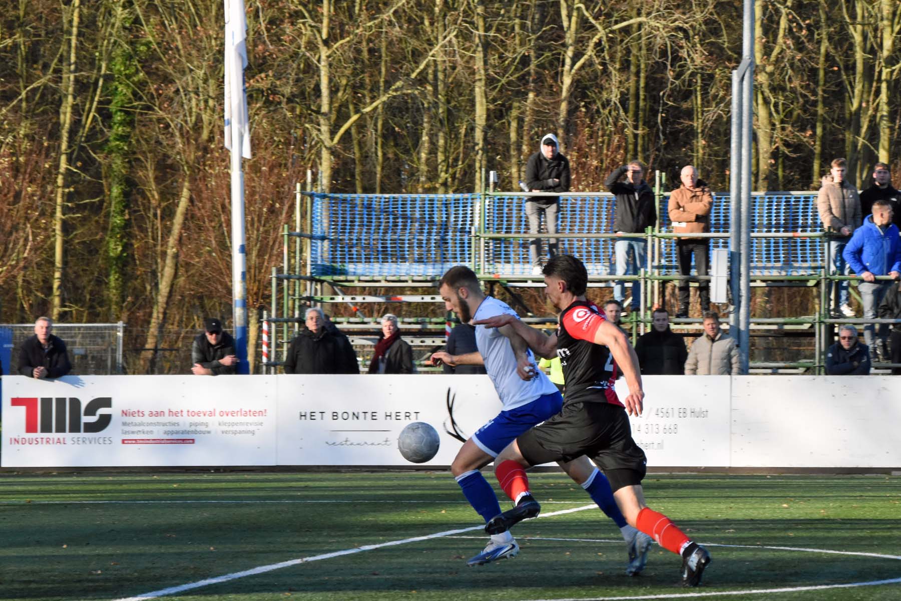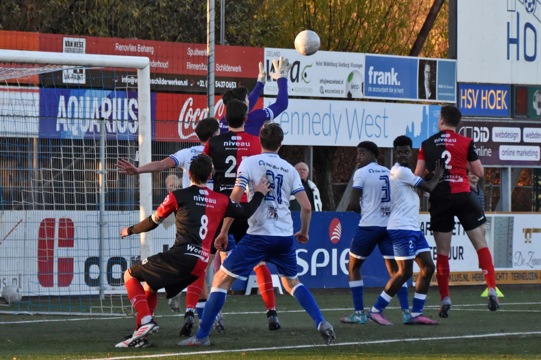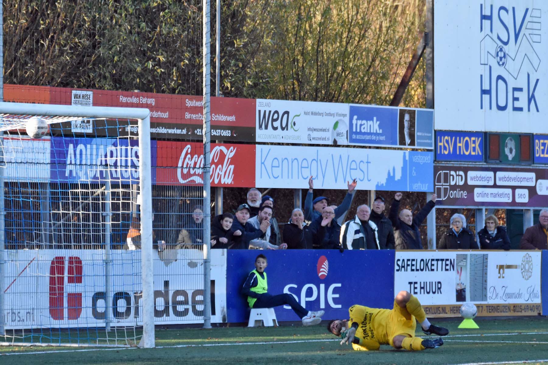 Op een sfeervol sportpark sloot Hoek het kalenderjaar in stijl af. De Zeeuws-Vlamingen maakten er samen met De Treffers in de eerste helft een aantrekkelijke strijd van, met volop kansen aan beide kanten. Al na vijftien minuten tekende Rousseau De Poorter voor een waar kunststukje: na een indrukwekkende solo vanaf eigen helft poeierde hij de bal van twintig meter onderkant lat binnen. De vreugde was echter van korte duur. Tien minuten later bracht Jari van Ginkel de stand op gelijke hoogte door een corner binnen te tikken bij de tweede paal. Hoek kreeg vervolgens kansen om opnieuw op voorsprong te komen, maar zowel Martens als Sula wisten het net niet te vinden. Vlak voor rust leek scheidsrechter Smeenk De Treffers een voorsprong te schenken met een makkelijk gegeven strafschop, maar keeper Finn Murre redde knap op de inzet van Van Bakel, waarmee hij zich tot held van het moment kroonde.