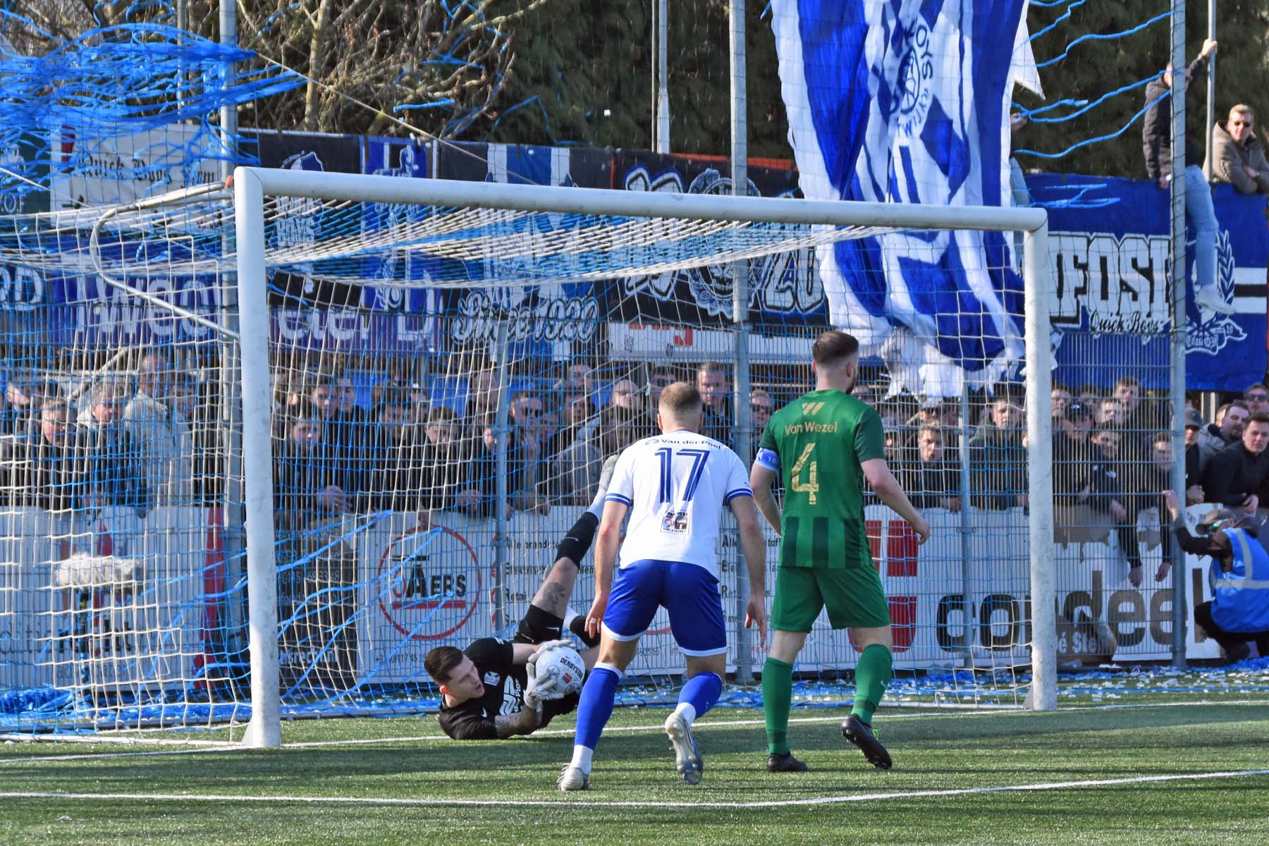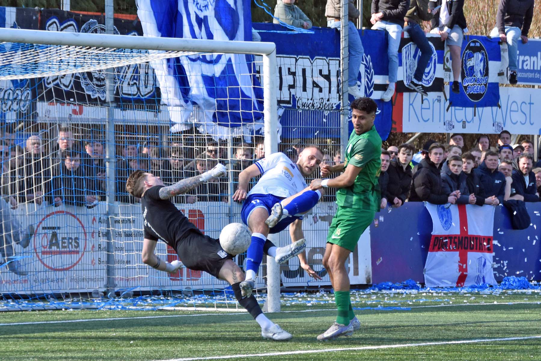 de keeper van Quick Boys staat voortreffelijk te keepen...