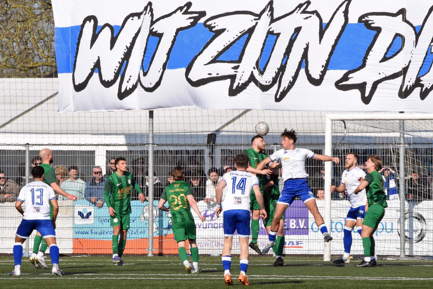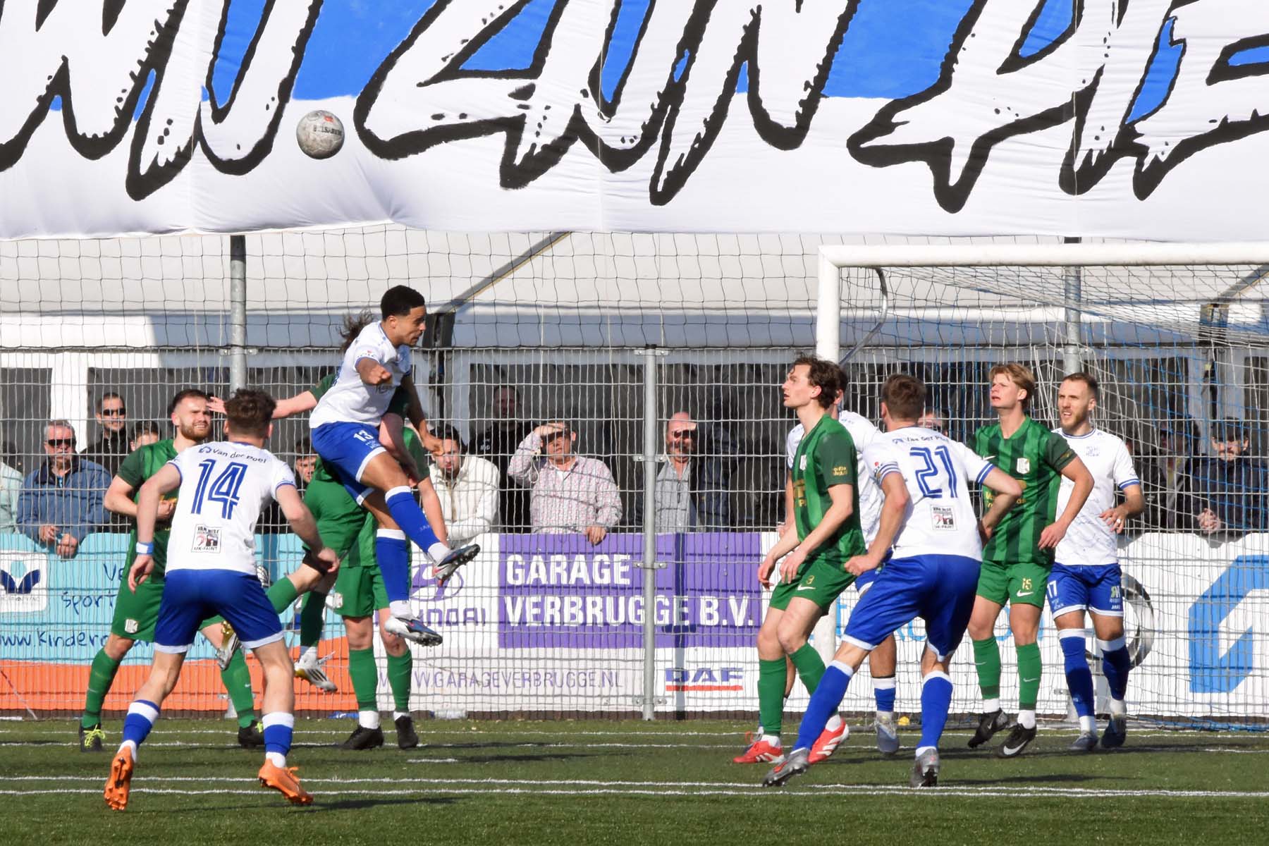 vrije trap voor HSV Hoek. Gertjan Martens probeert de bal te koppen..