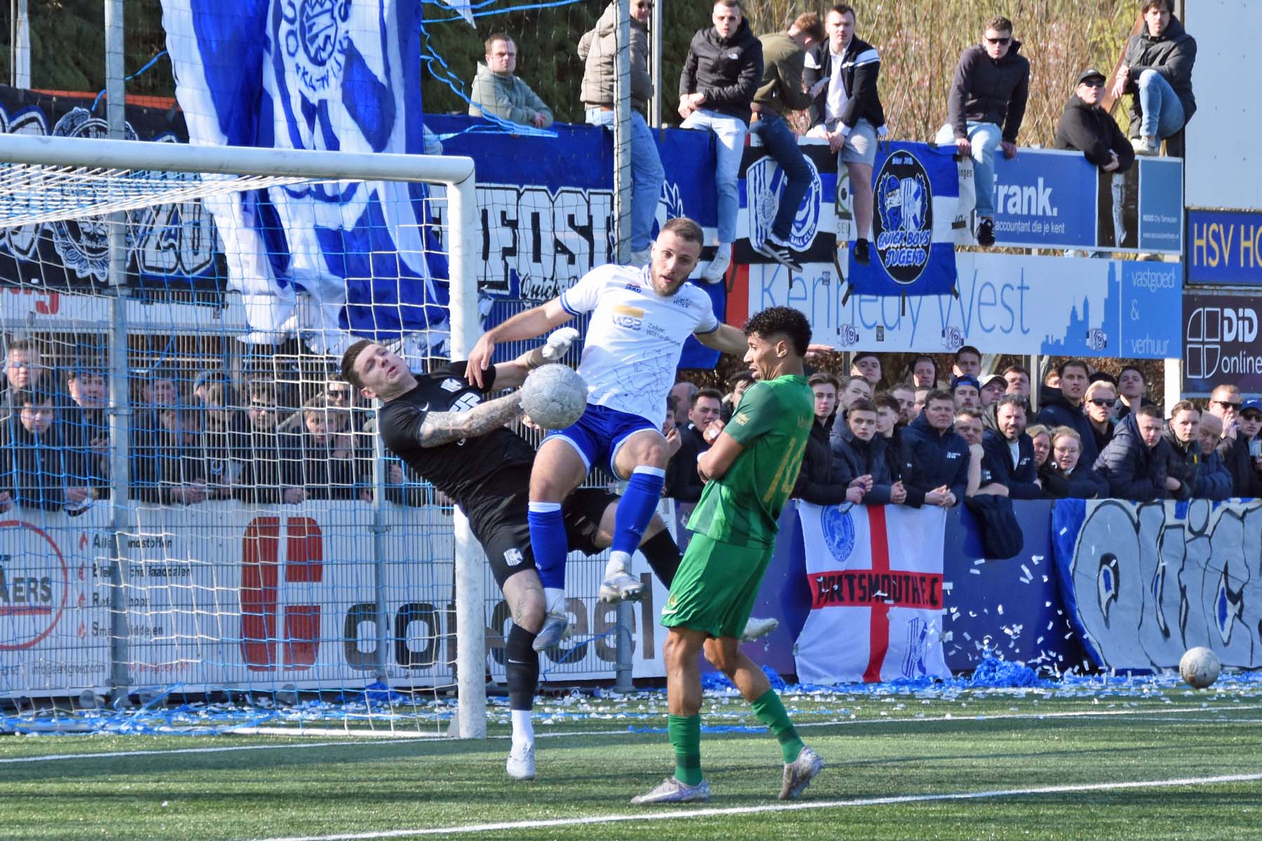 de keeper van Quick Boys komt. Din Sula is eerder bij de bal dan de keeper van Quick Boys, Din Sula kopt..