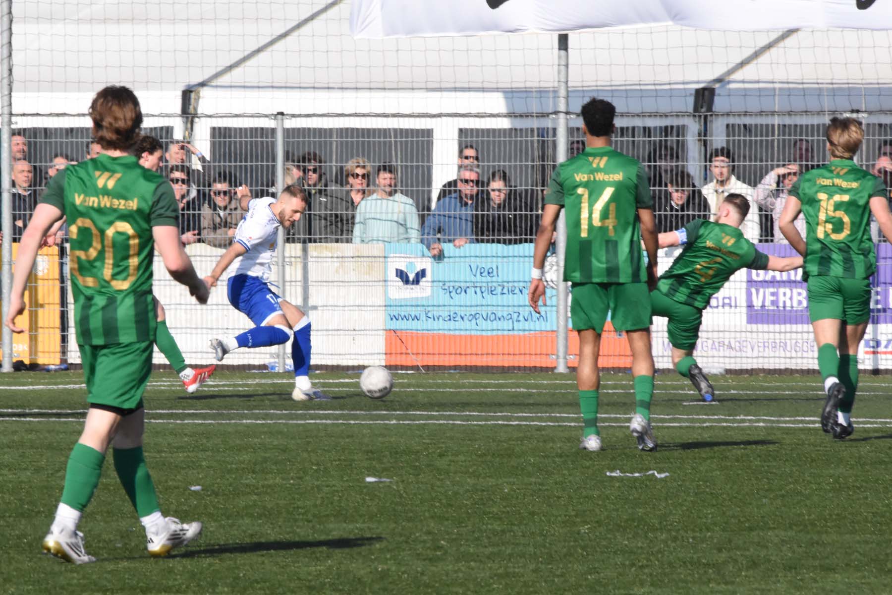 de bal komt voor de voeten van Jarno Lion. Jarno Lion aarzelt niet en haalt uit..