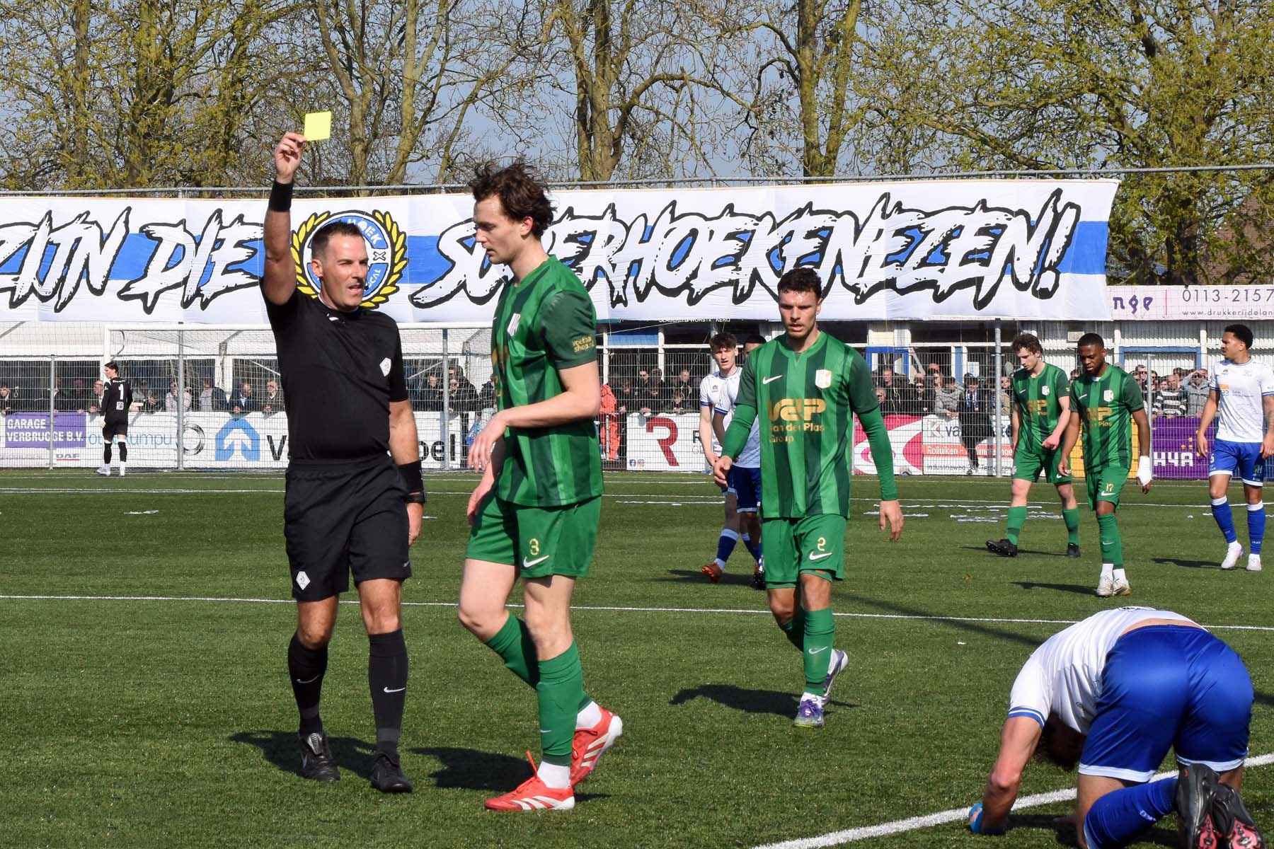 de scheidsrechter bestraft de overtreding met geel en een vrije trap voor HSV Hoek...