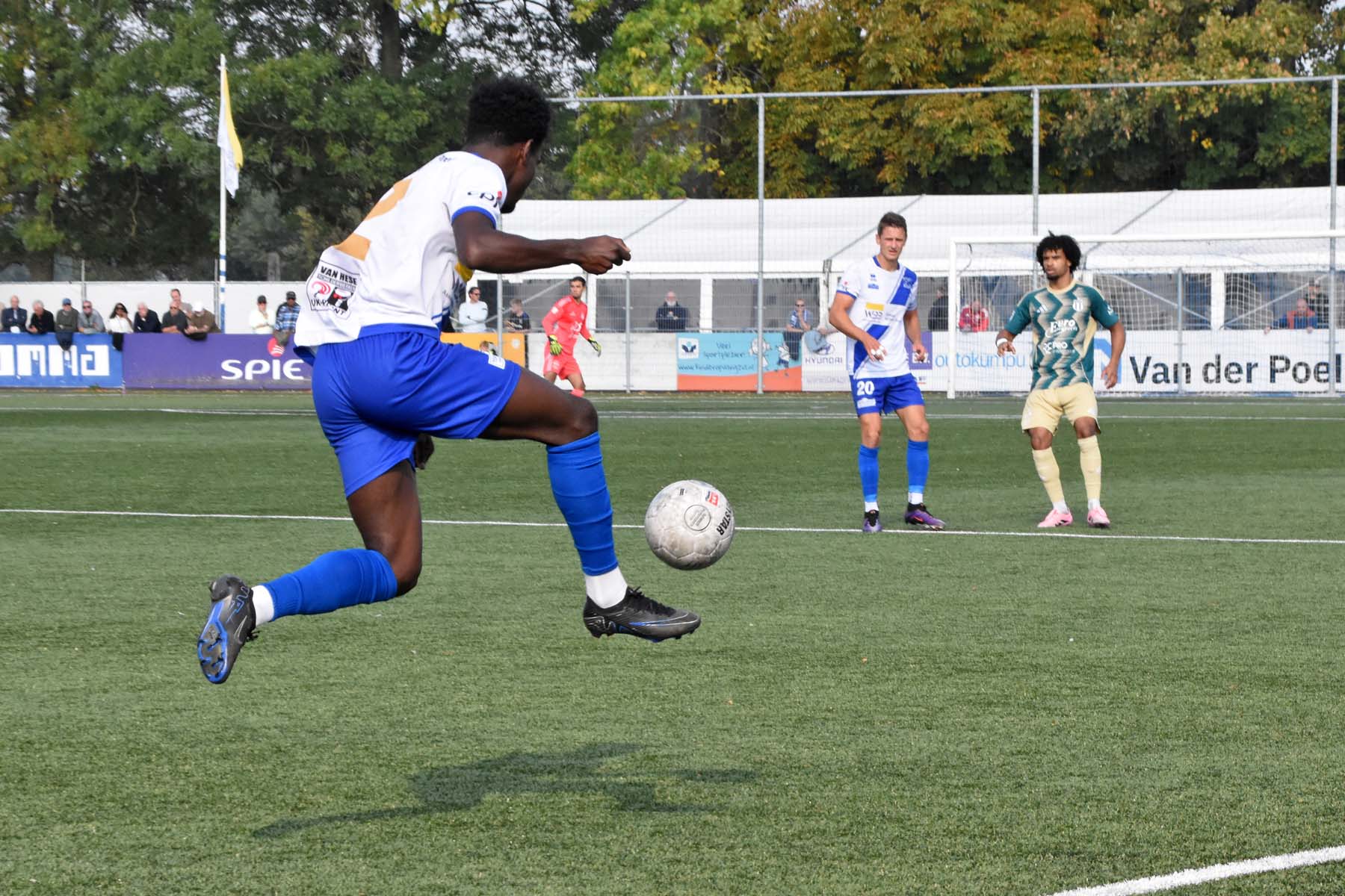 Din Sula, in het veld gekomen voor Steve Schalkwijk, oog in oog met de keeper van Excelsior Maassluis..