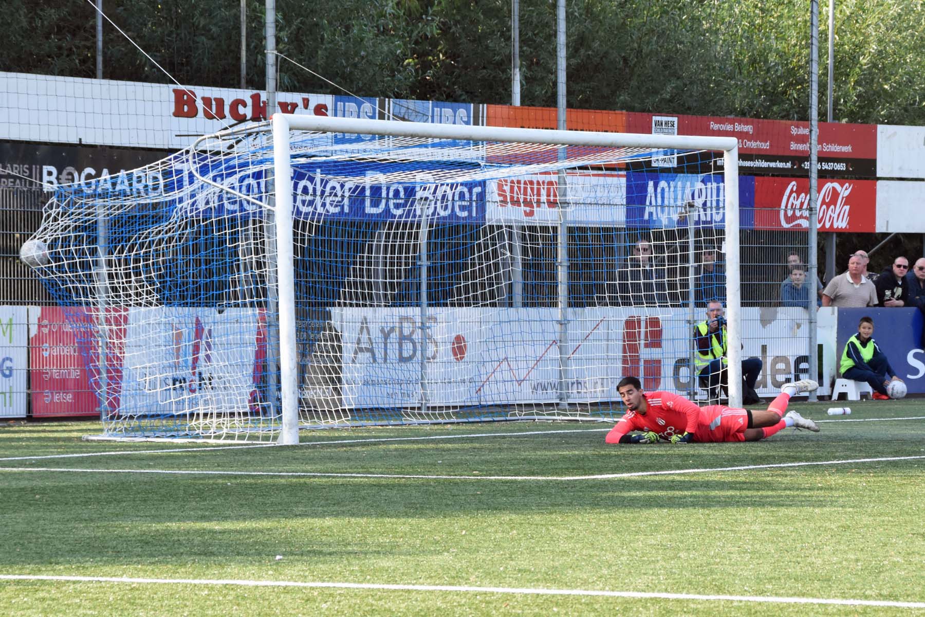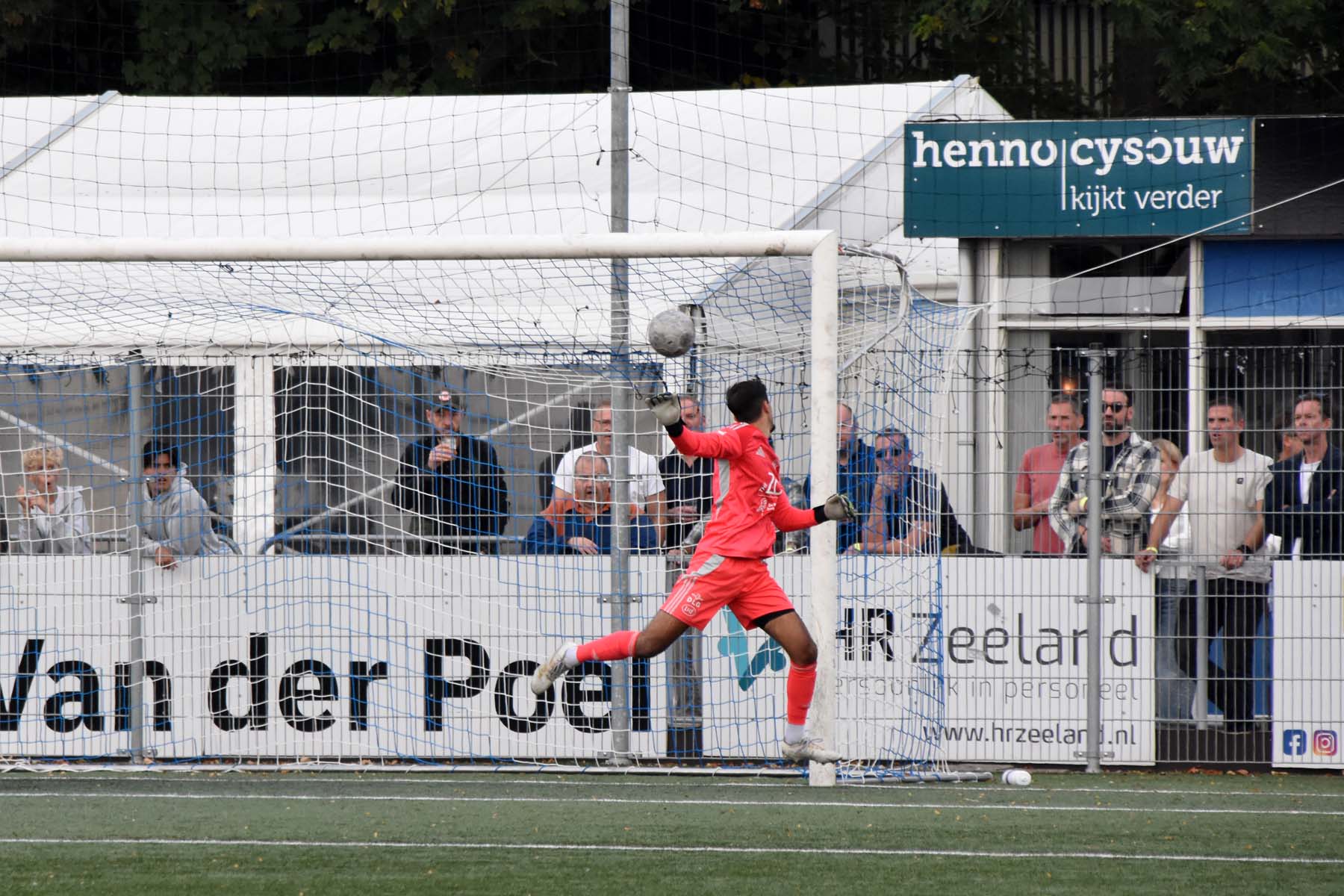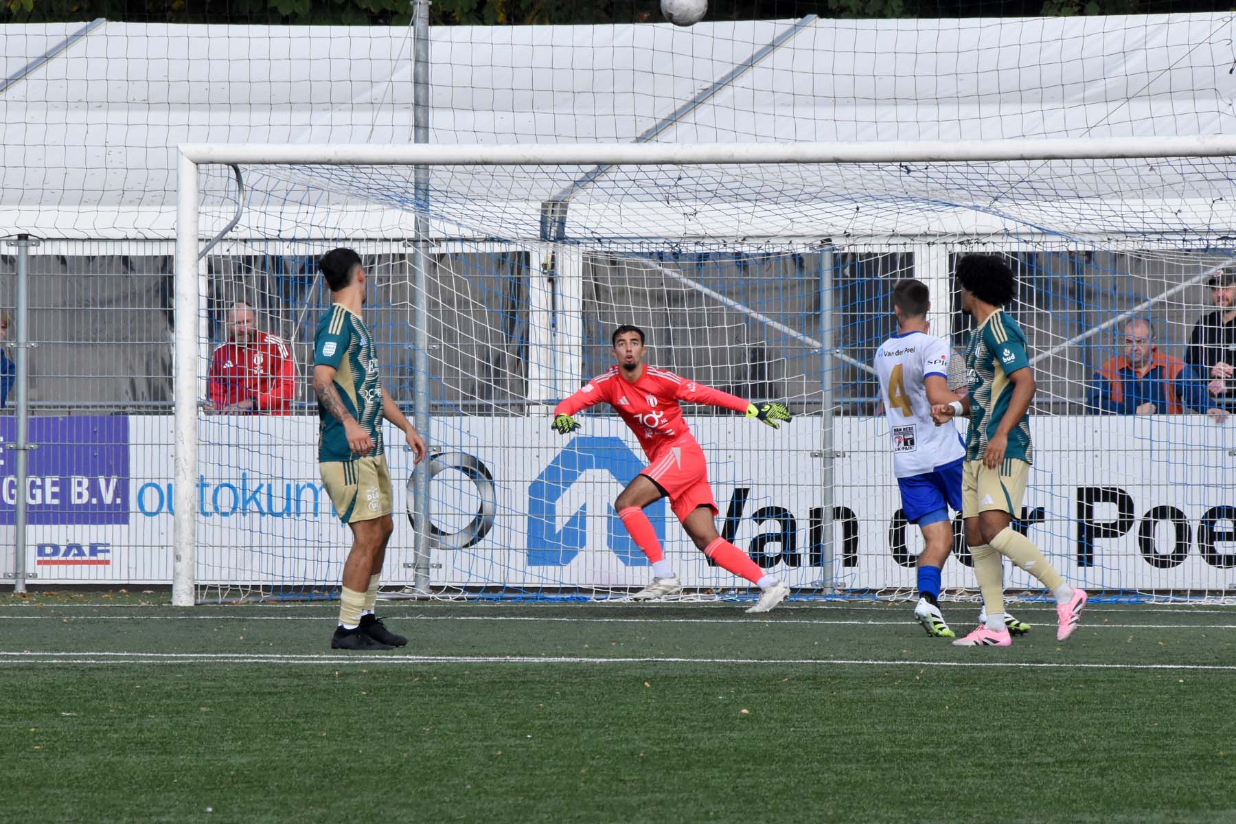 de keeper van Excelsior Maassluis heeft die bal alleenmaar gehoord..