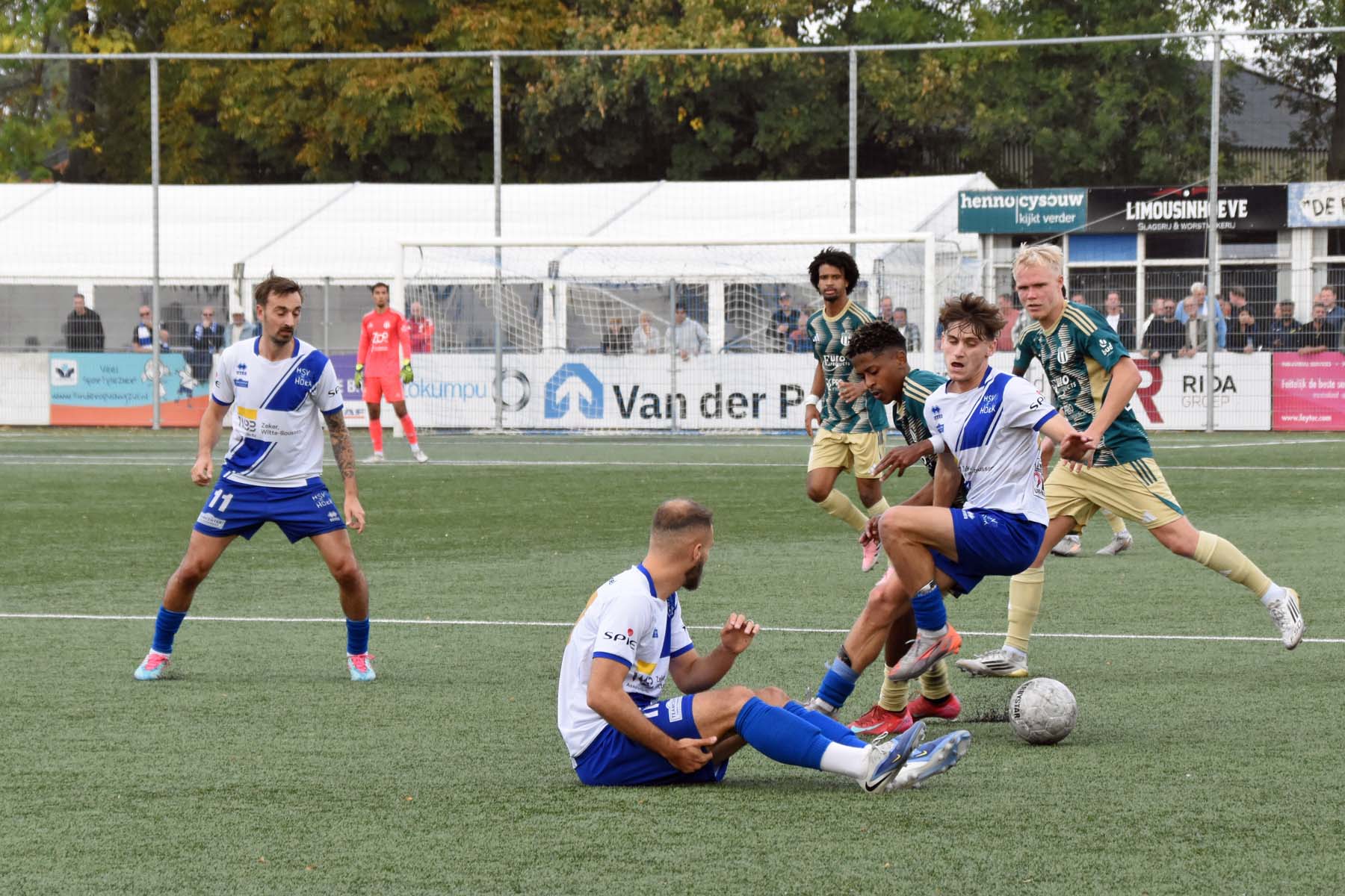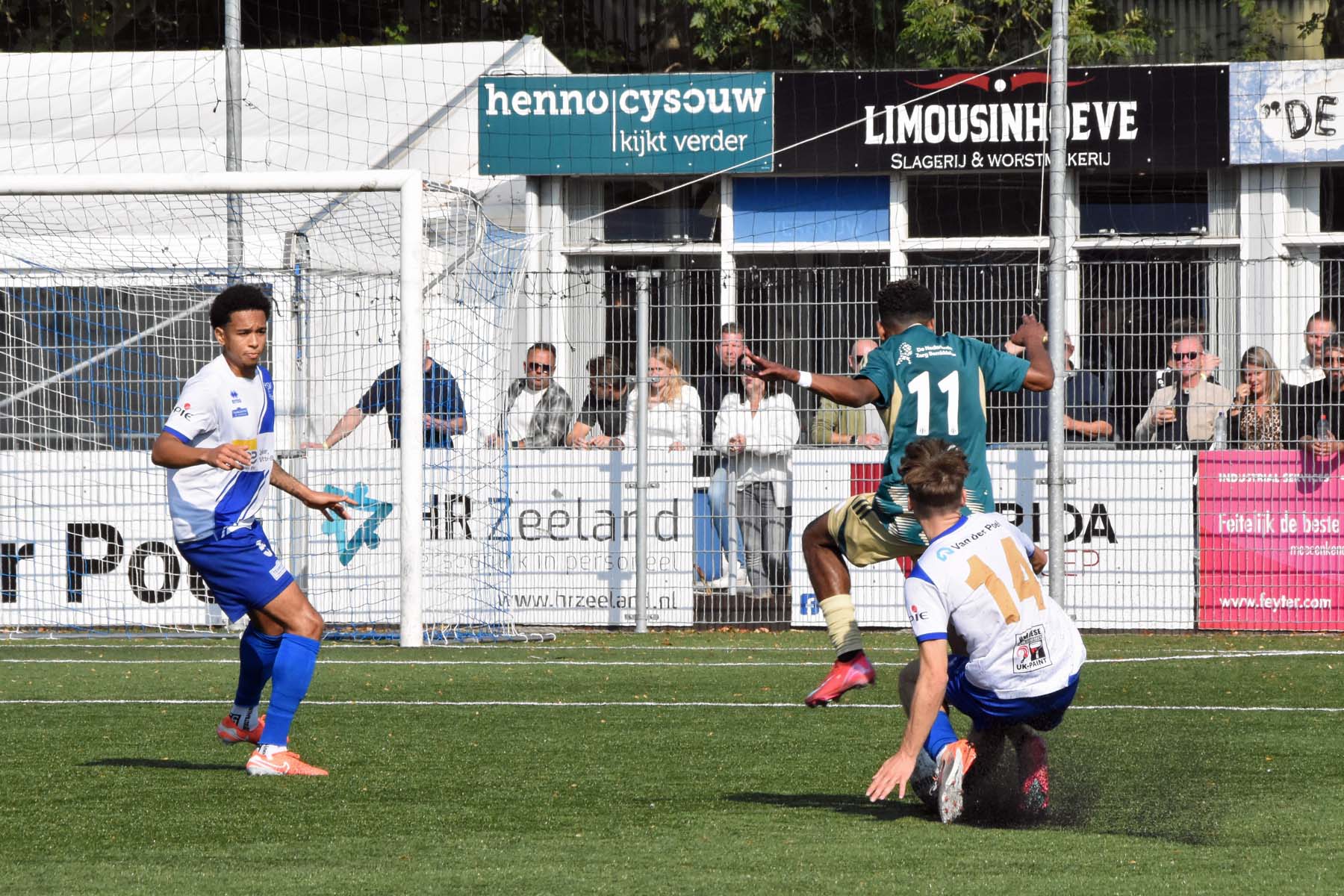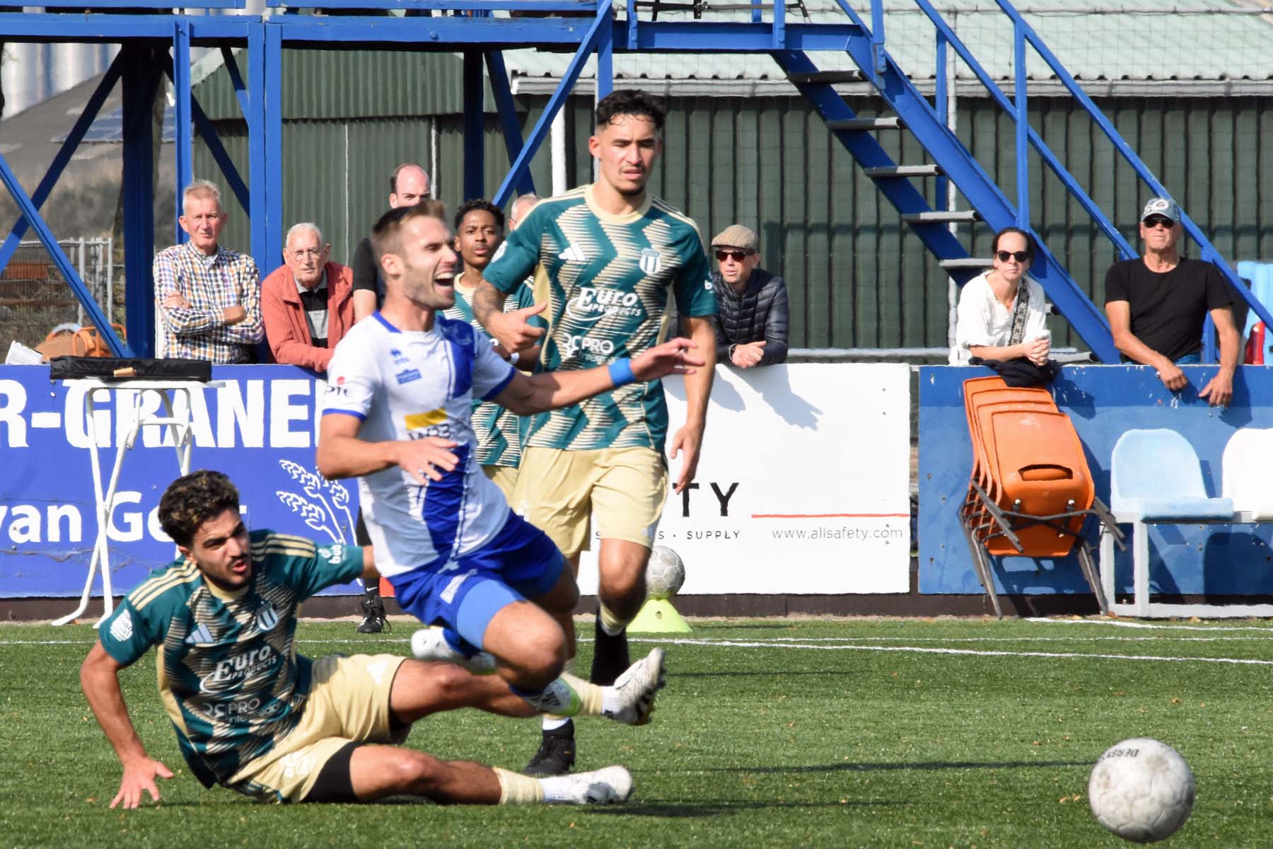 Corner voor Excelsior Maassluis. Wout den Engelsman gooit zich voor zijn directe tegenstander en kopt de bal weg.