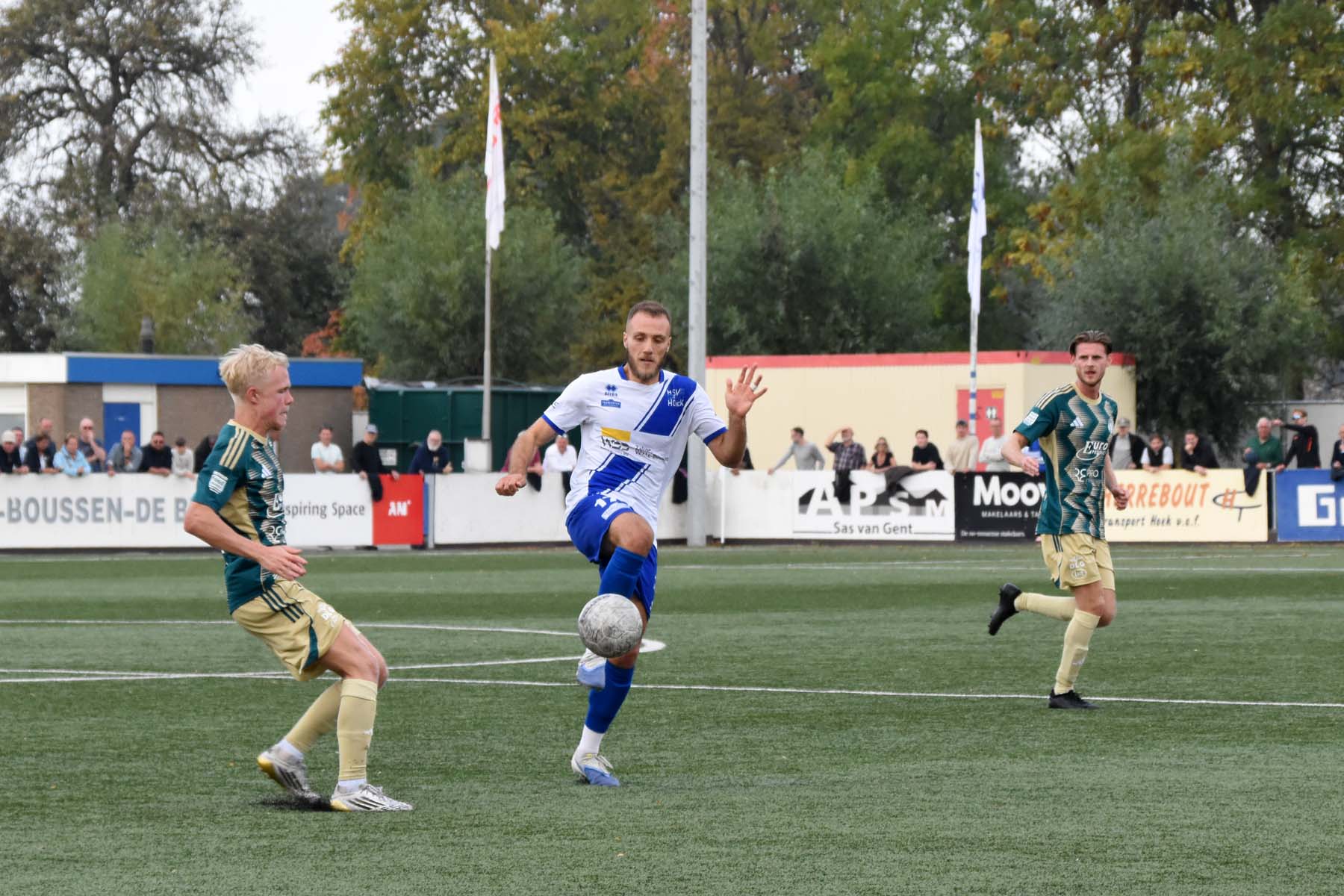 Eerste waarschuwing van Excelsior Maassluis. Tussen Wout den Engelsman en Gertjan Martens probeert de spits toch over Finn Murre te krijgen..