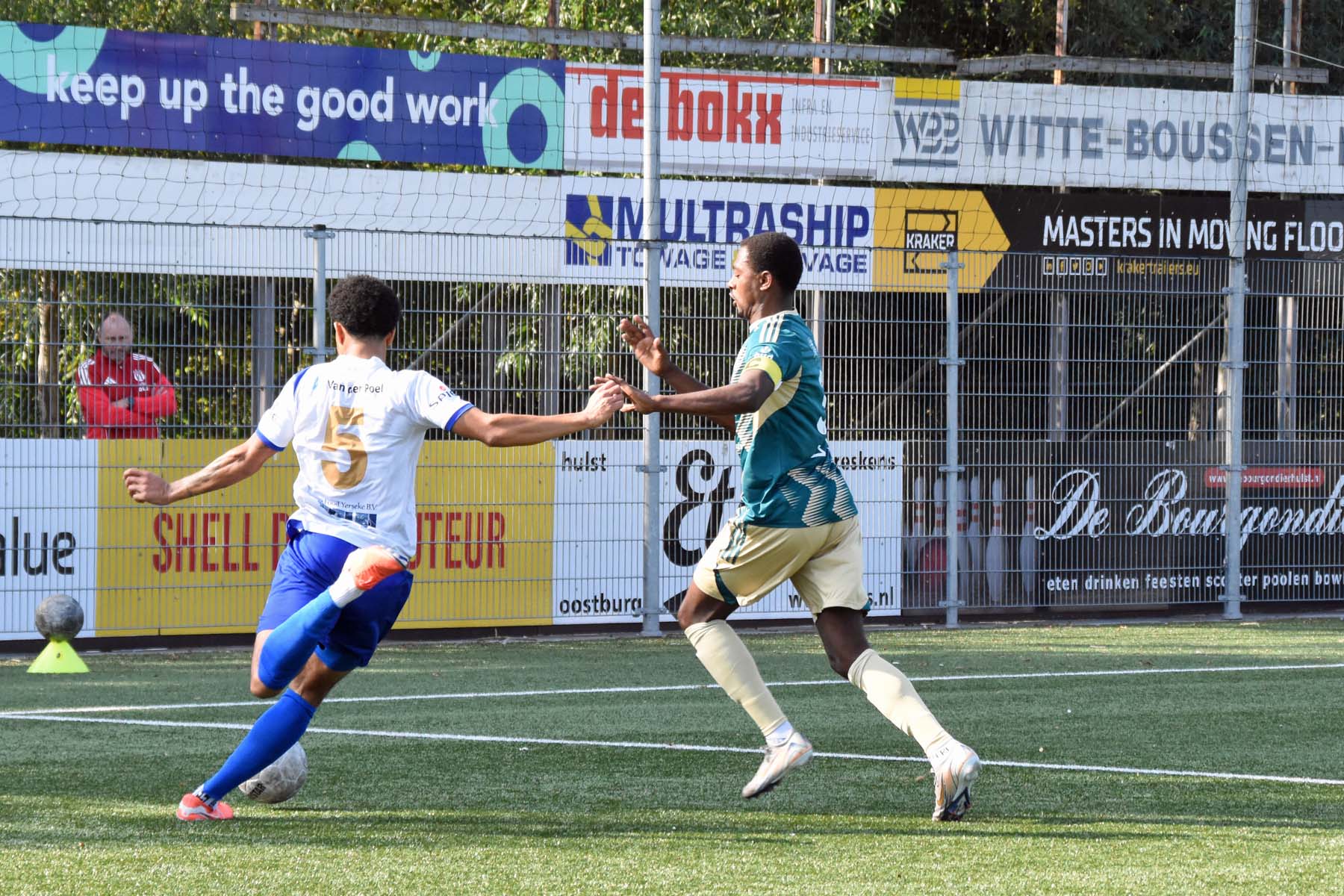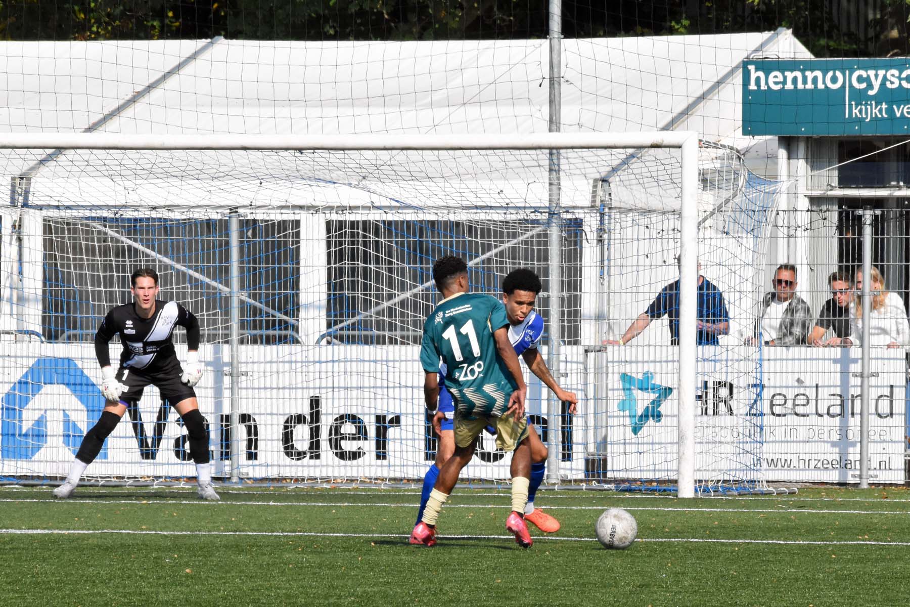 de verdediger van Excelsior Maassluis schiet de bal in eigen doel, corner rest voor HSV Hoek...
