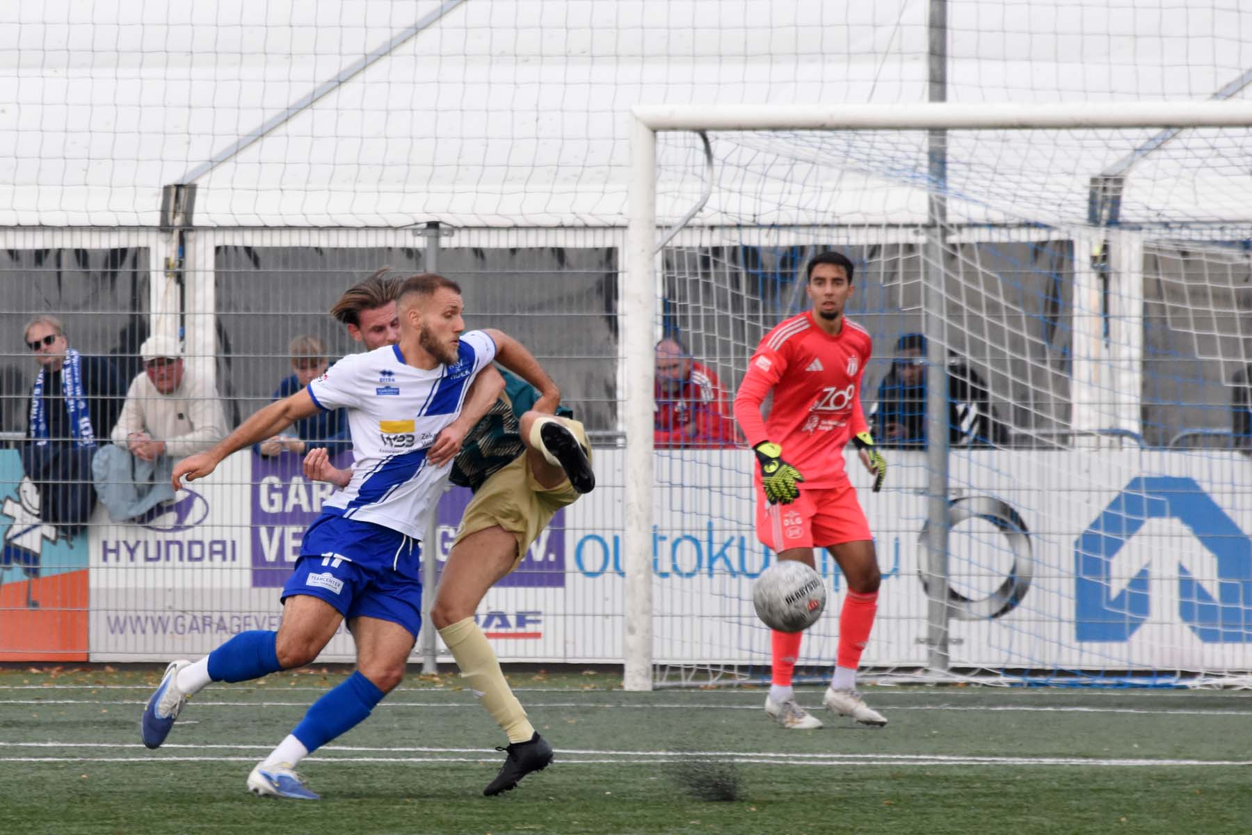Excelsior Maassluis heeft nog maar 1 punt behaald in de competitie, toch is het een taaie tegenstander. De verdediger van Excelsior Maassluis probeert voor de bal te gaan..